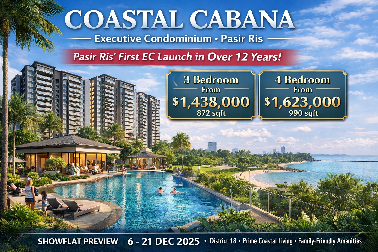 Coastal Cabana is more than a new residential launch; it represents a long-awaited opportunity to experience refined coastal living in the eastern heart of Singapore. Priced from $1,639 per square foot, this executive condominium brings together thoughtful design, strategic location, and long-term investment value. With unit sizes ranging from 872 square feet for three-bedroom homes to 990 square feet for four-bedroom residences, Coastal Cabana answers the growing demand for spacious, well-planned homes in a mature and vibrant district.